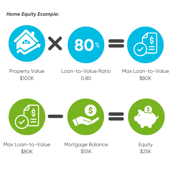 If your home is valued at $100,000 you may borrow up to 80% of its value or $80,000. If you already have a home loan of $55,000 you would have $25,000 in equity that you may be able to borrow ($80,000 - $55,000 = $25,000).